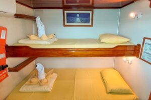 Die Aida María bietet 8 komfortable Doppelkabinen, jeweils für 2 Gäste mit Etagenbetten. Alle Kabinen sind gleich groß, verfügen über dieselben Annehmlichkeiten und denselben Preis und sind auf drei Decks verteilt: 4 auf dem Hauptdeck, 2 auf dem Oberdeck und 2 auf dem Sonnendeck.